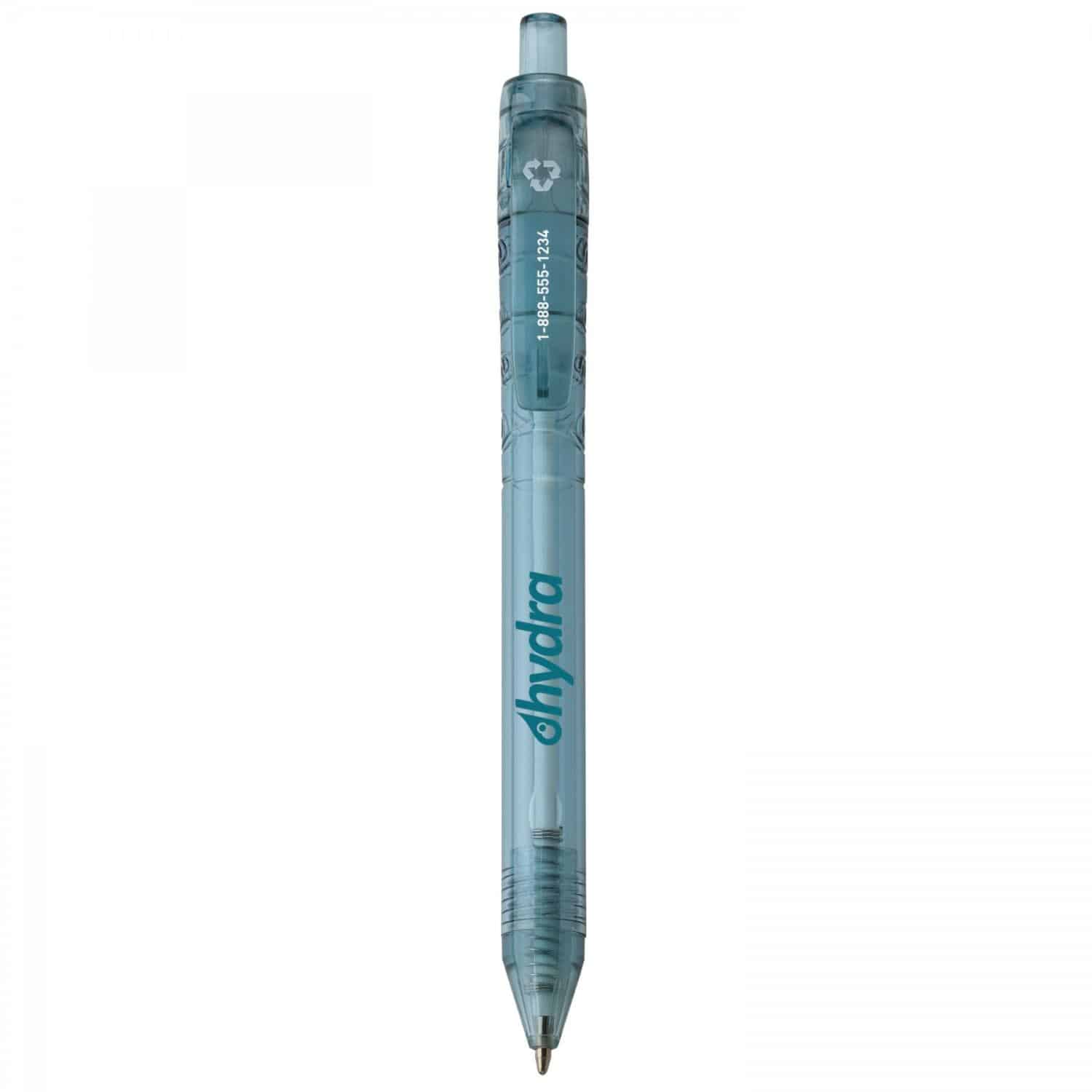 Recycled plastic push-action pen with a recycled symbol printed on clipBRMade with 80 recycled materials from plastic water bottles. 5.5000″ L x 0.5000″ W x 0.0000″ H
