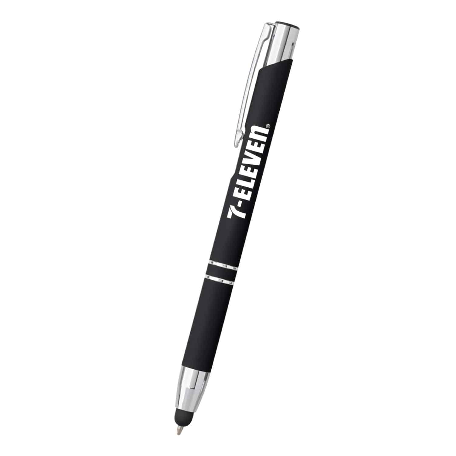 Plunger Action. Rubberized Aluminum Pen. Push Down To Use Pen And Retract To Use Stylus. Complies with Prop 65. 5.5″ H