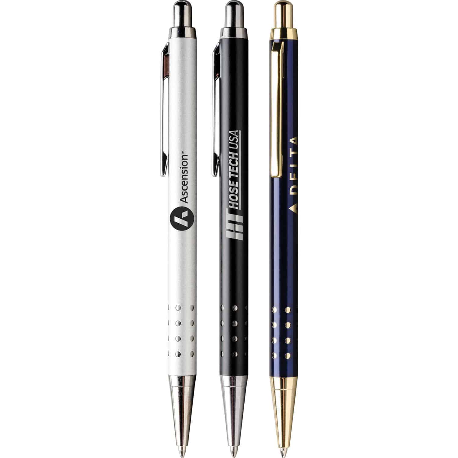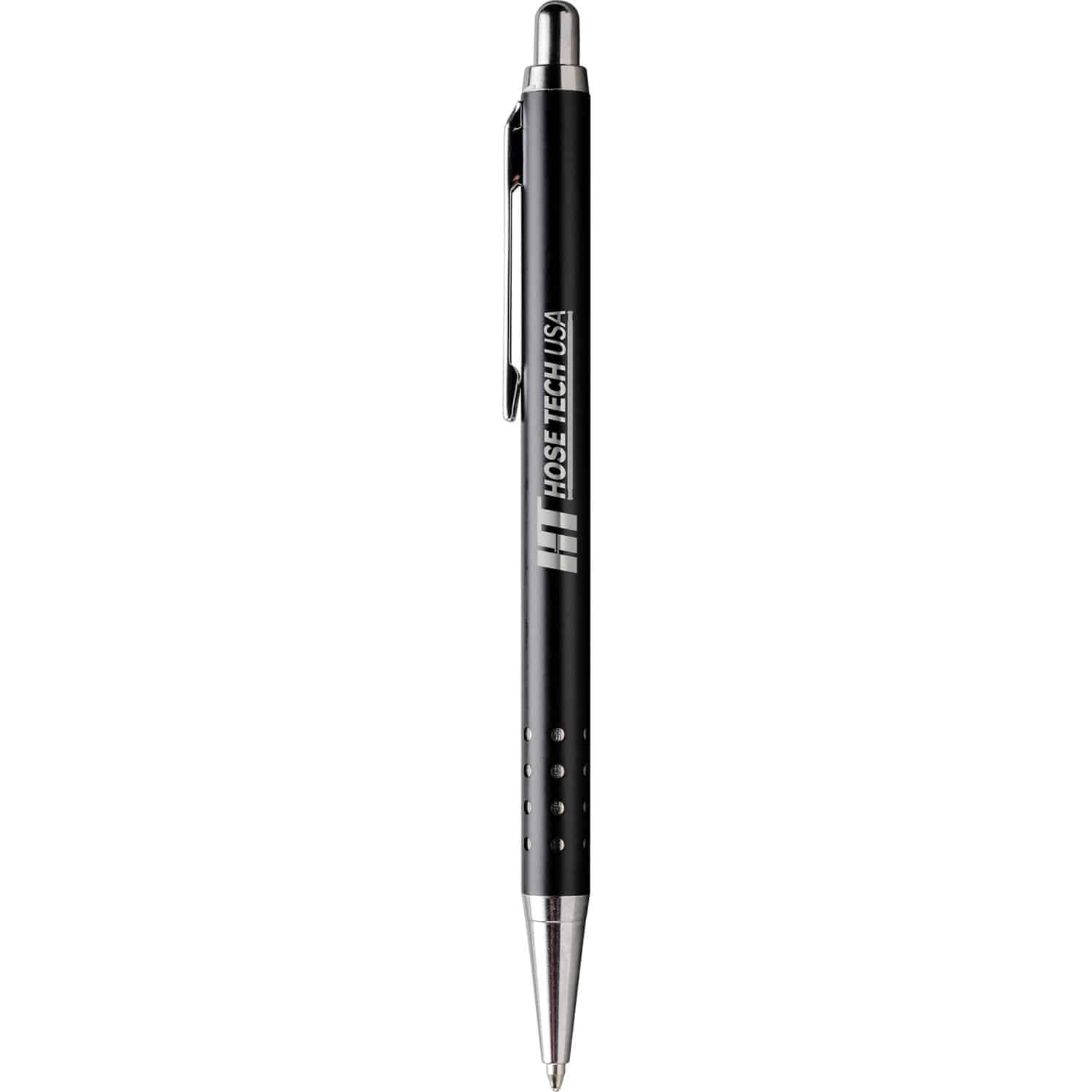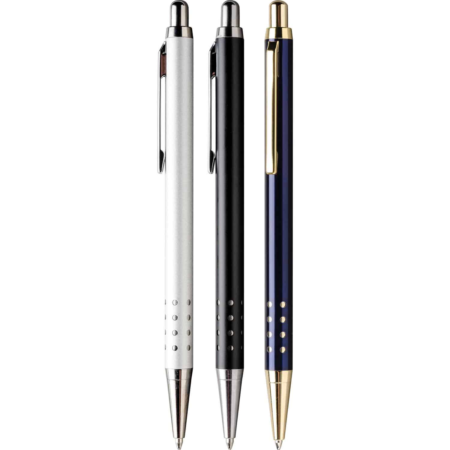 Quality brass retractable ballpoint pen with a stylish European look. The unique 24 hole grip exposes silver or gold accents underneath. Brushed silver has oxidized black imprint. High quality jumbo steel black ink cartridge. Complies with Prop 65.