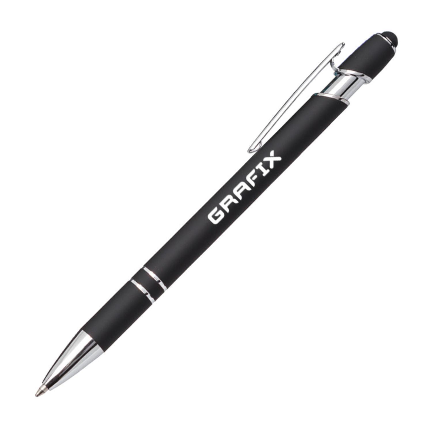The Kurt Clicker Pen & Stylus features a satin metal barrel in various vibrant colors, chrome accents, a stylus pusher, and rubberized soft-touch coating for maximum comfort.