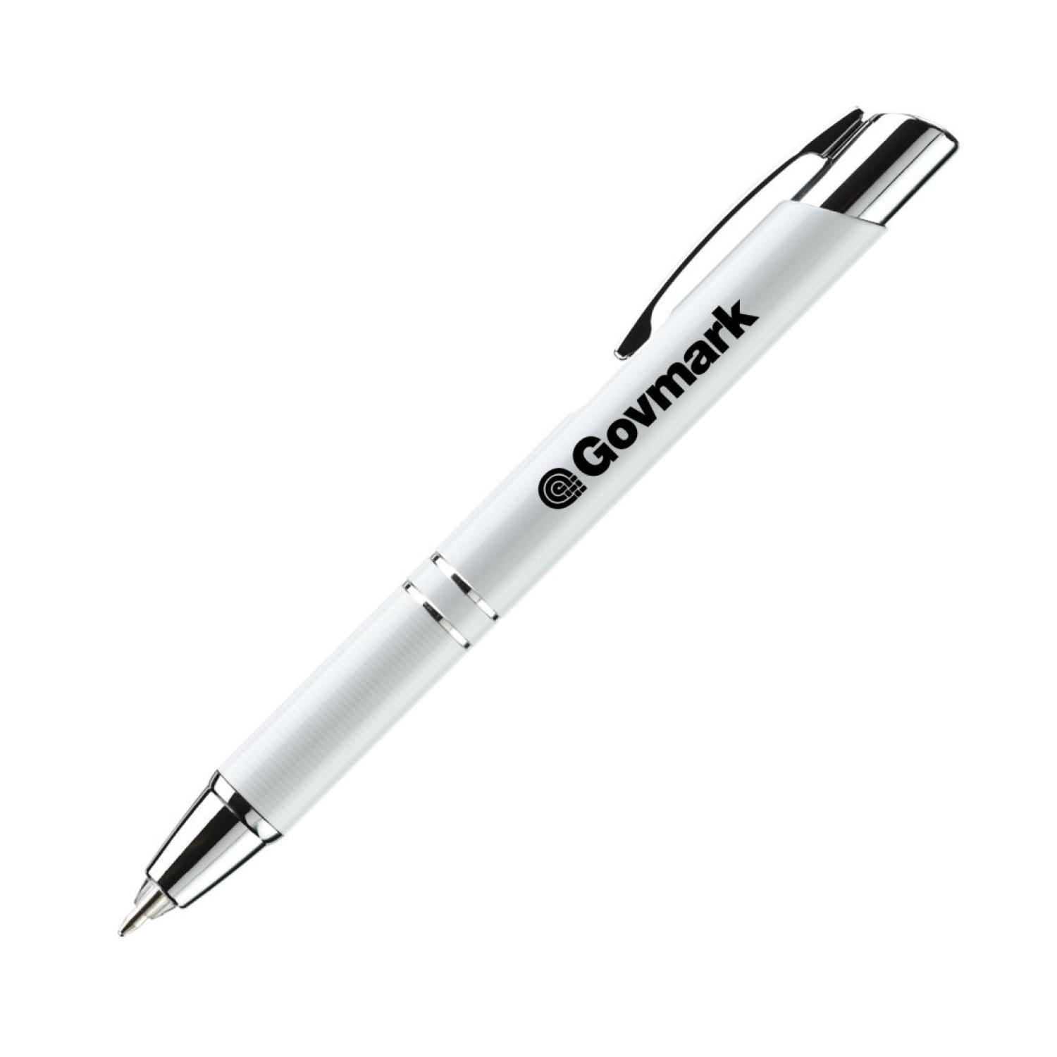 Metal click-action ballpoint pen with textured comfort grip and built in LED light, which highlights writing surface.