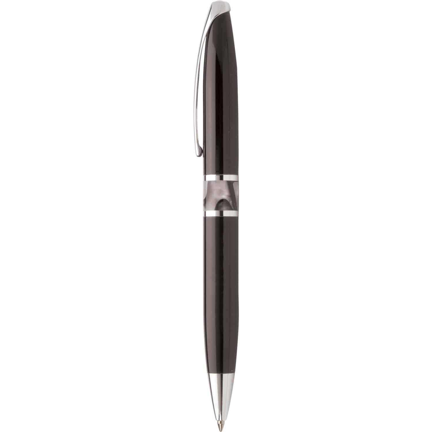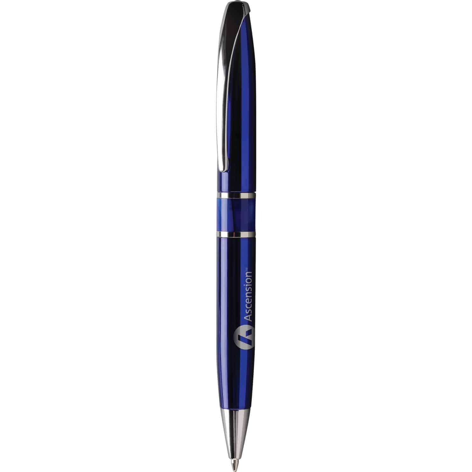 Contemporary style twist action retractable executive pen. High gloss enamel or brushed silver with marble look acrylic center band and silver accents. Highest quality jumbo metal black ink cartridge. Cambridge Collection lifetime guarantee. Complies with Prop 65. 5.55″ L x 0.48″ Diameter
