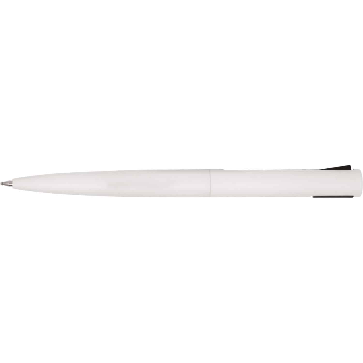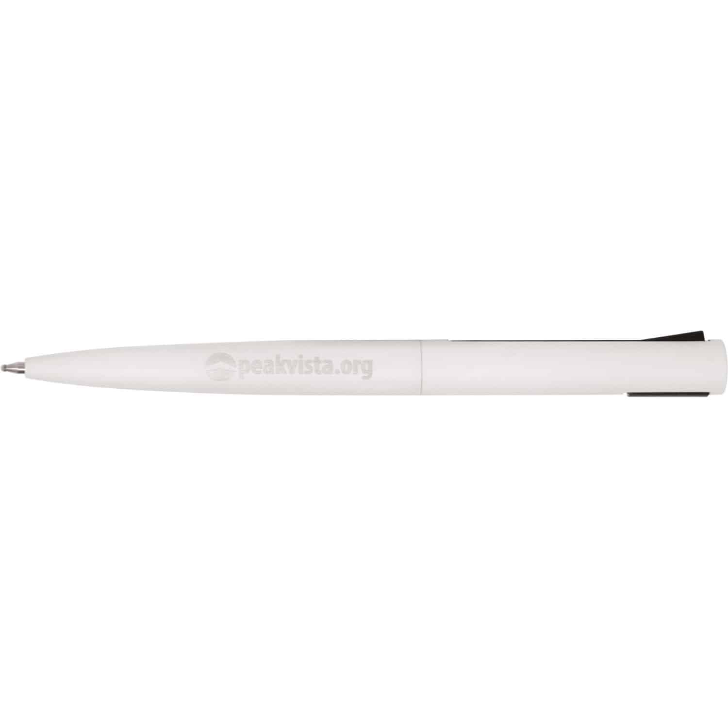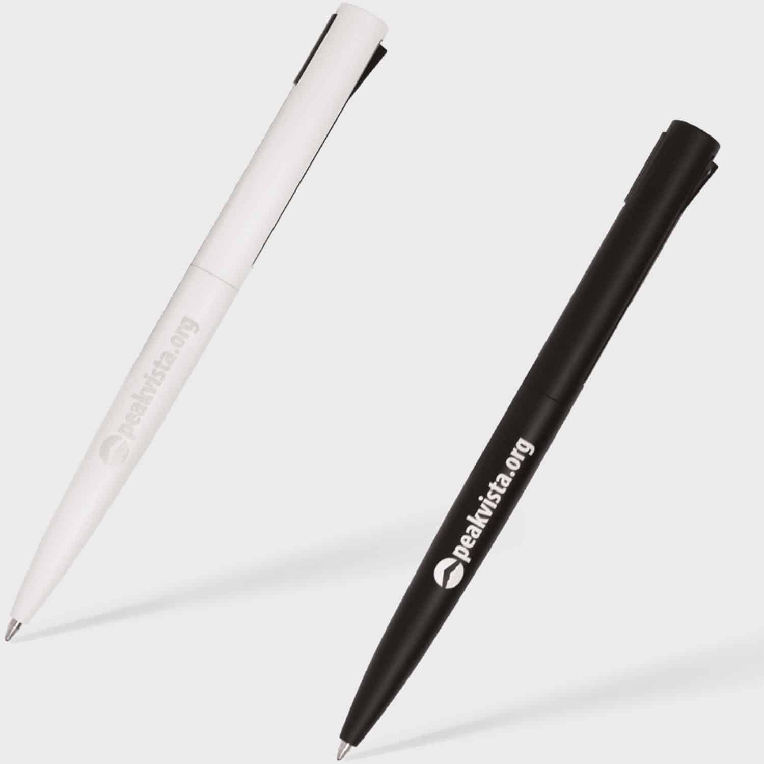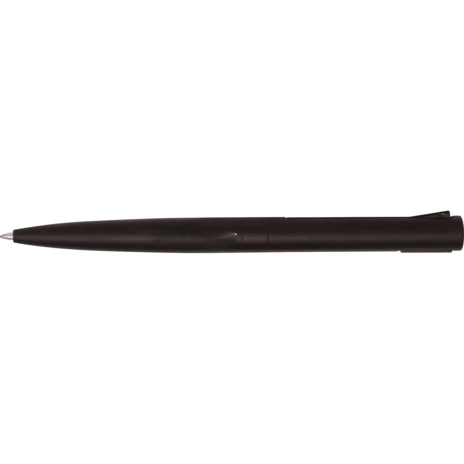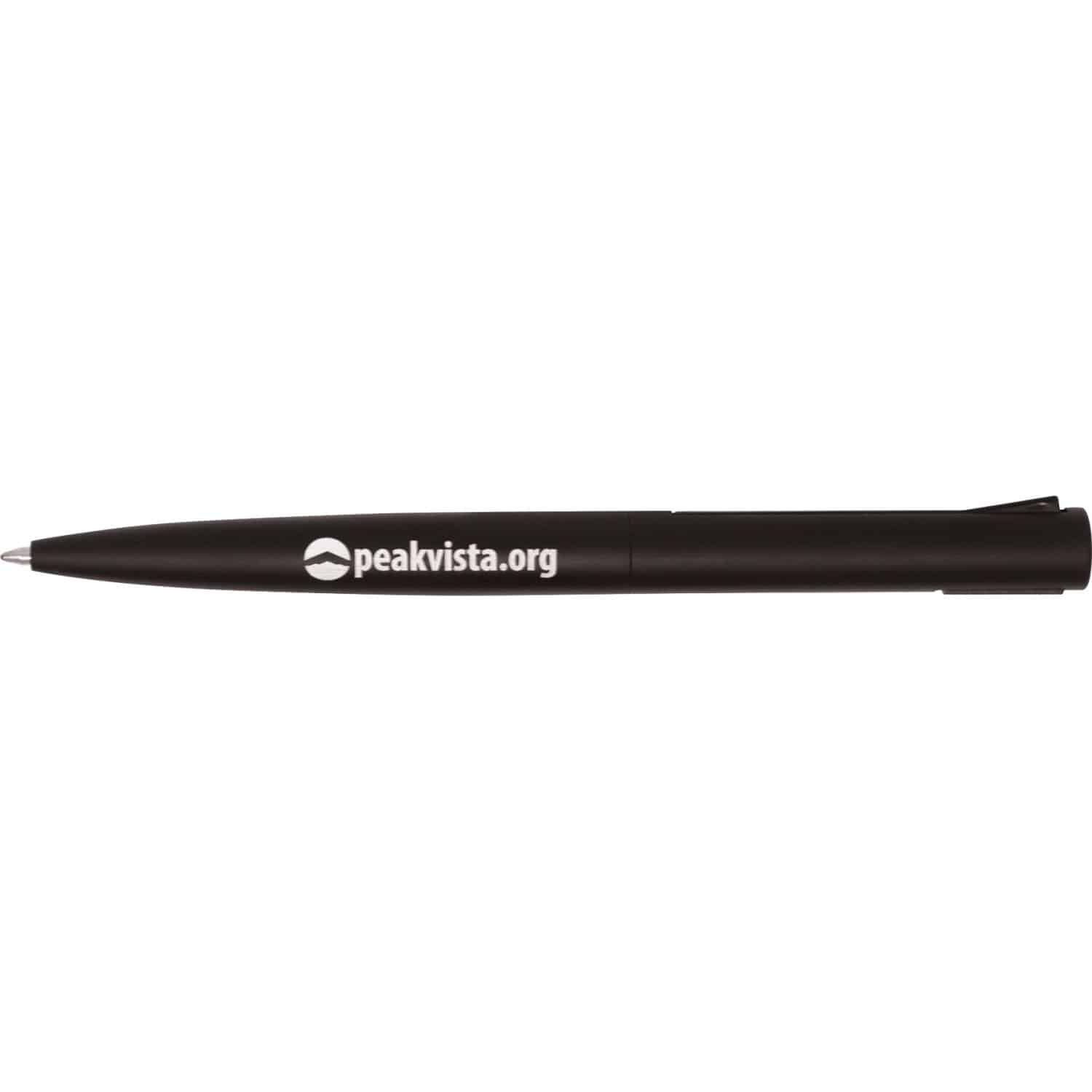 Slim line executive metal pen features a unique clip retraction: Just try to resist fidgeting with the clip! Black pen has a subtle rubber comfort finish. Full Color imprint available. Complies with Prop 65. 6.375″ L x 0.375″ Diameter