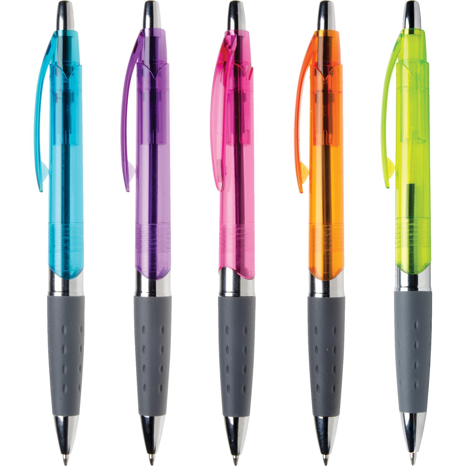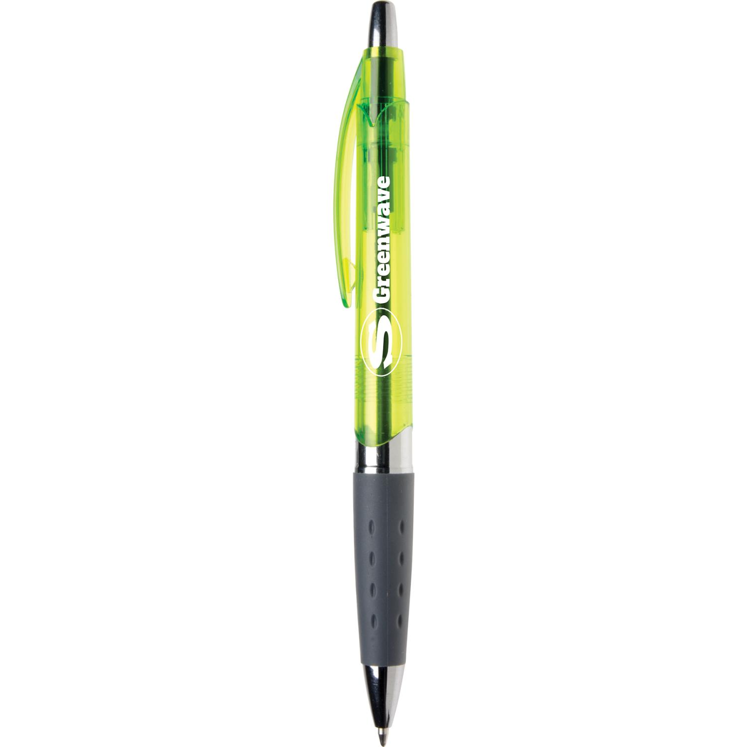 Bright translucent jumbo barrel has a generous imprint area. Shining chrome cigar band trim sets off imprint. Dimpled charcoal gray rubber grip provides writing comfort. Super smooth black ink. Complies with Prop 65. 5.58″ L x 0.4″ Diameter